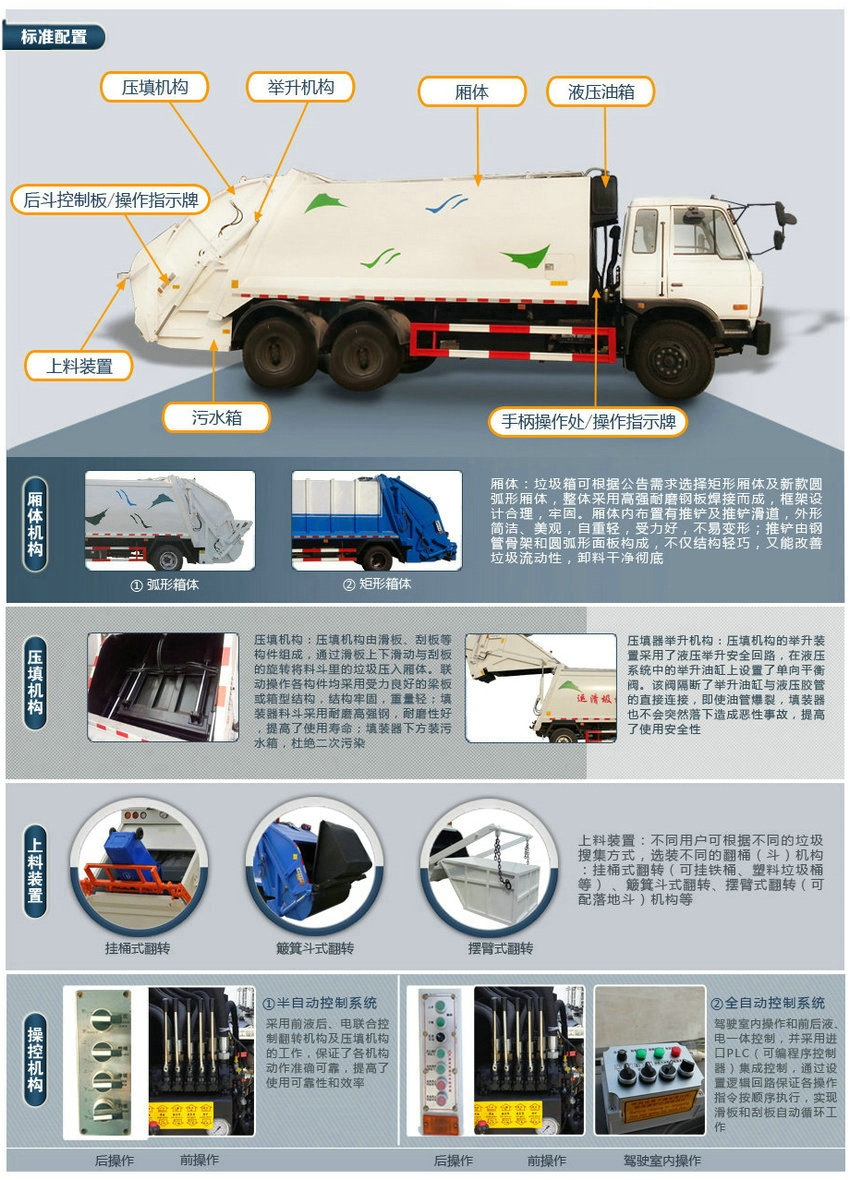 標準: 壓縮式垃圾車:采用機、電、液聯(lián)動控制系統(tǒng)、電腦控制及手動操作系統(tǒng),通過填裝器和推鏟等裝置實現(xiàn)垃圾倒入、壓碎或壓扁,并將垃圾擠入車廂并壓實和推卸。