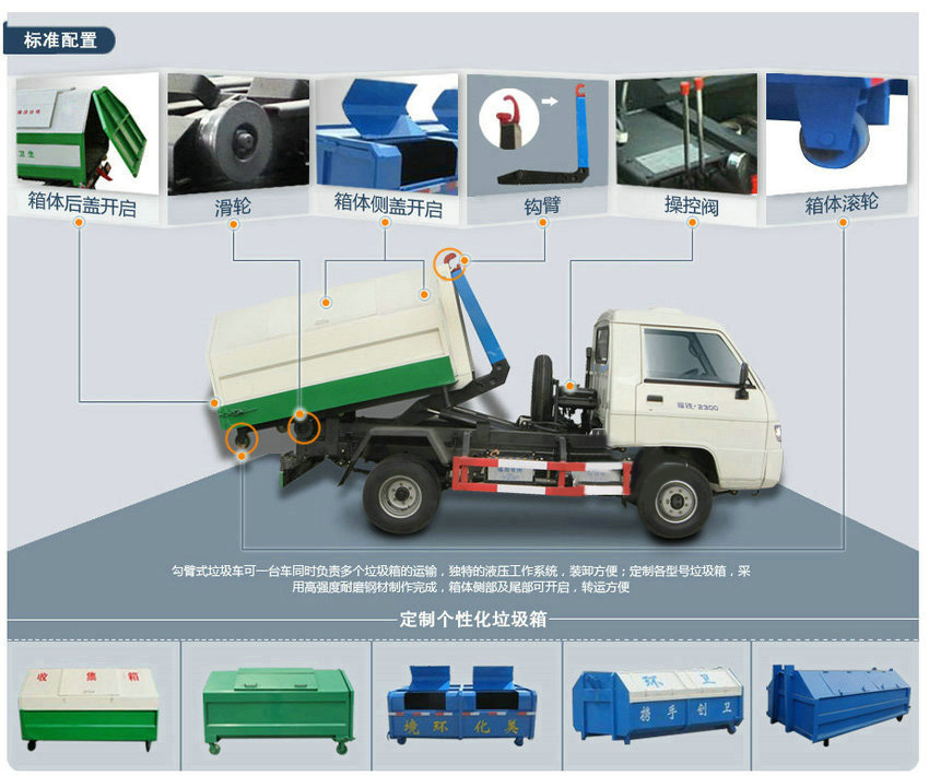 標(biāo)準(zhǔn): 車廂可卸式垃圾車:廣泛適用于城市街道學(xué)校垃圾處理,可一車配多個(gè)垃圾廂,各個(gè)垃圾點(diǎn)放置多個(gè)垃圾箱,帶自卸功能,液壓操作,傾倒方便。